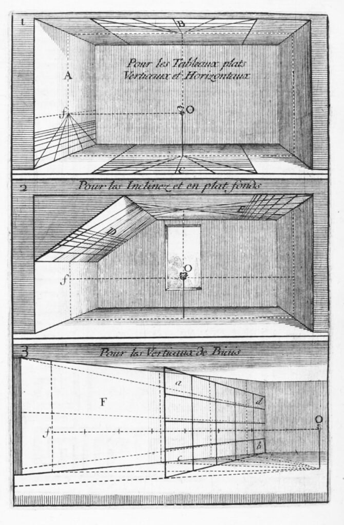 CEtte Planche est divisée en trois parties, sur lesquelles sont representées les positions ou scituations de six Tableaux plats. Dans la premiere en haut vous y voyez celuy A nommé Vertical. Et les deux B C nommez horizontaux, l’un comme B veu de bas en haut, & celuy C de haut en bas, Par l’Oeil O.