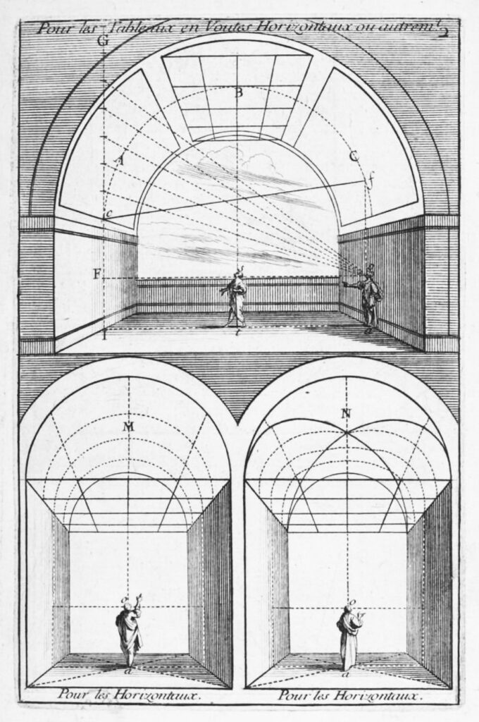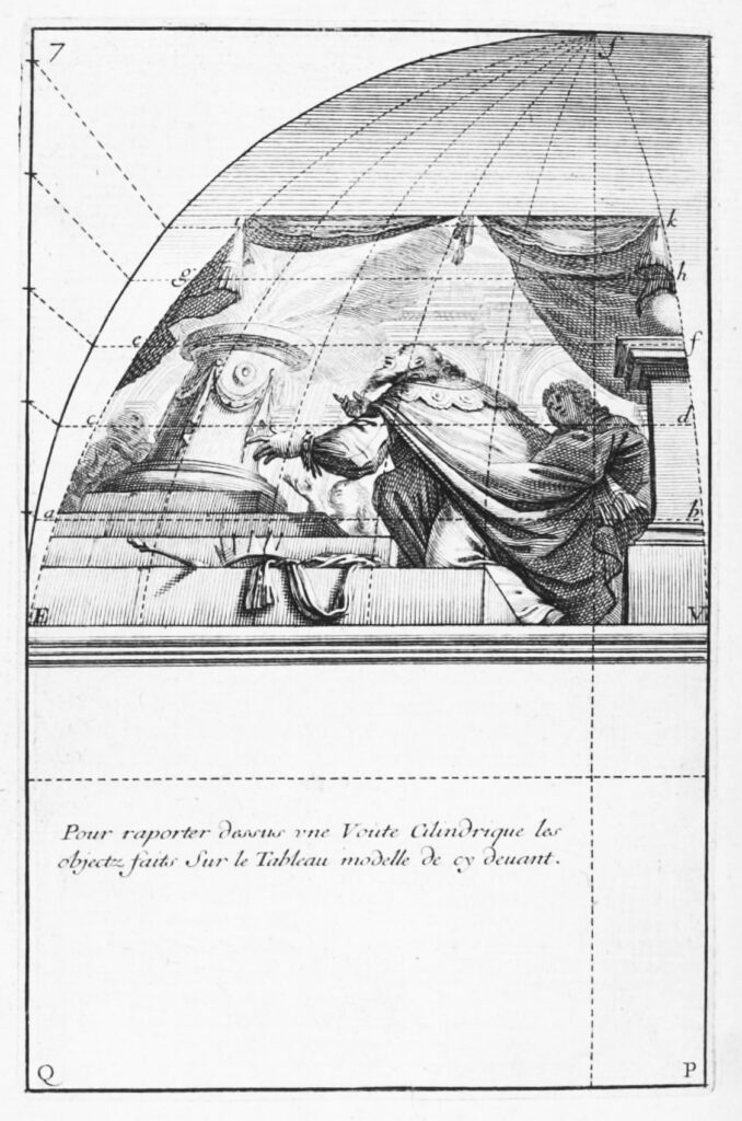 Mais comme les lieux où l’on est obligé de representer ces divers Tableaux, ainsi que sur les voûtes ou autres plats-fonds inclinez, leurs bazes sont eslevées plus haut que ces theatres, il faut subir à cette sujection, à moins que sur de tels Tableaux l’on y voulust representer des bas reliefs ou tels autres corps & ornemens qui ne demanderoient point de si grands esloignemens fuyants.