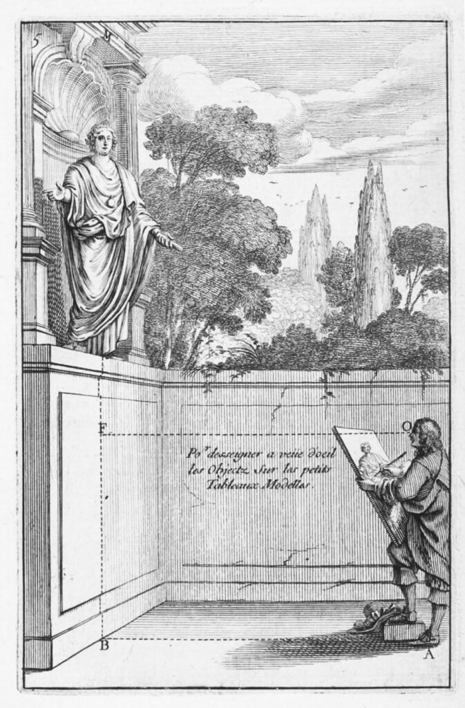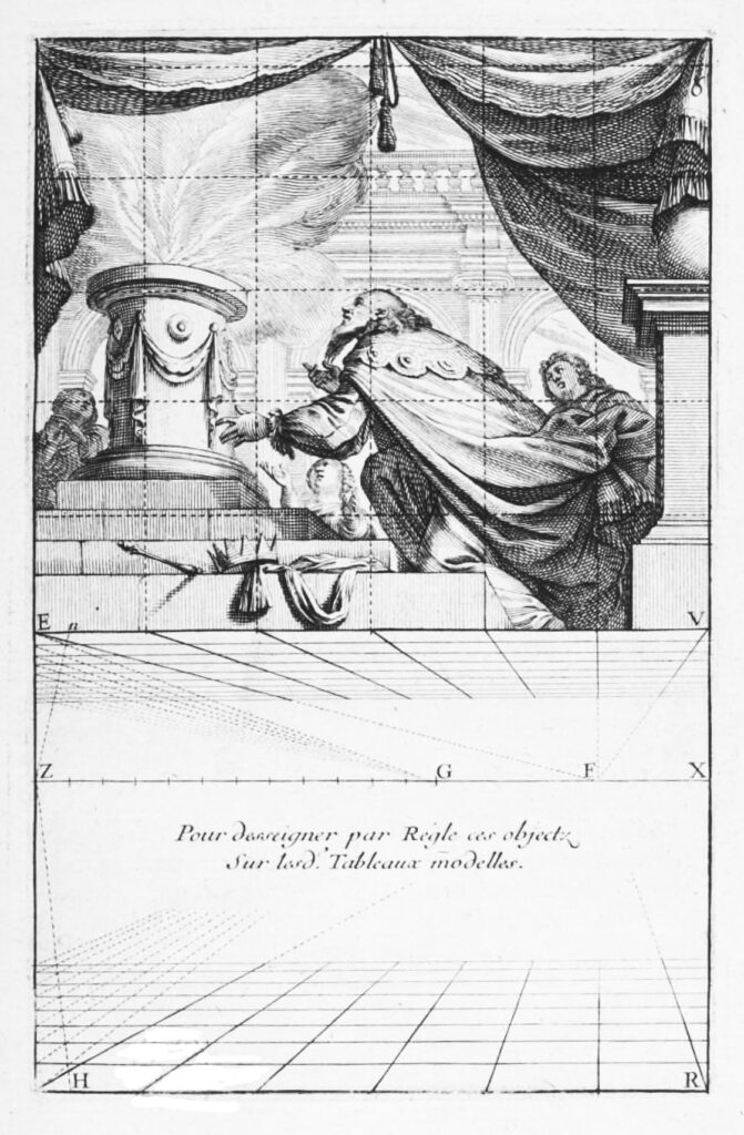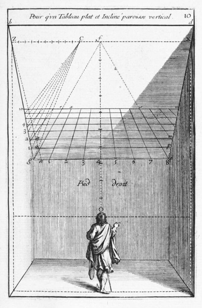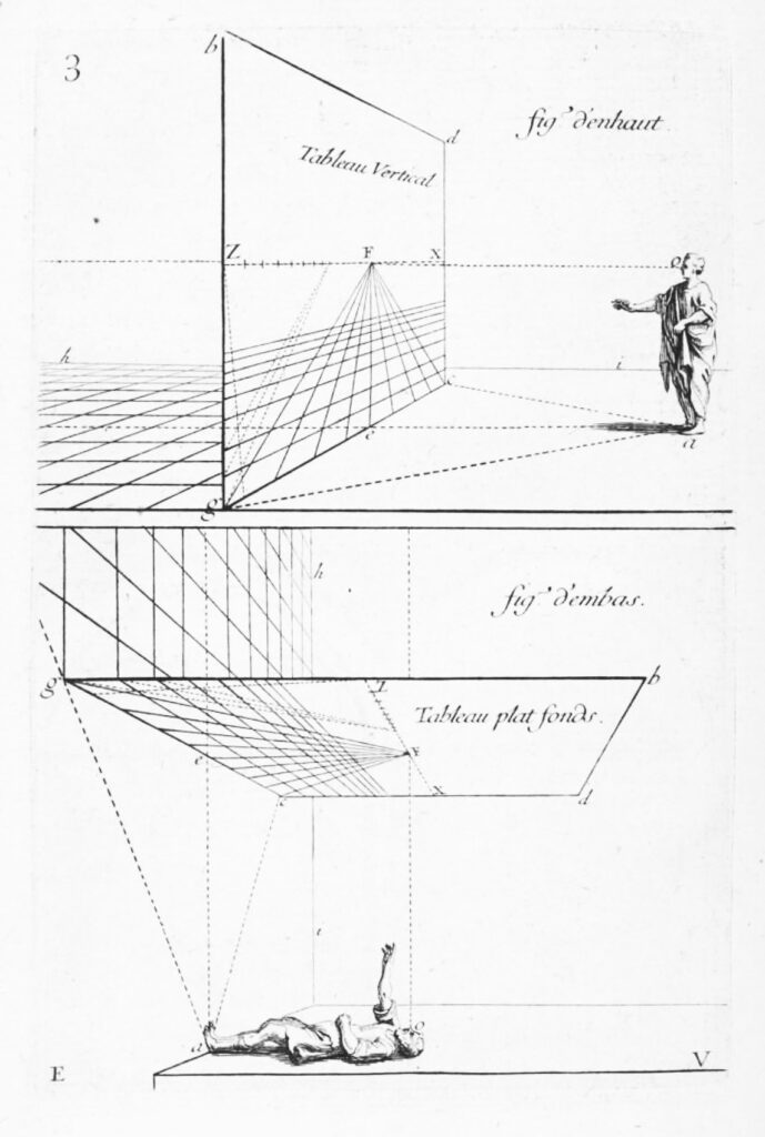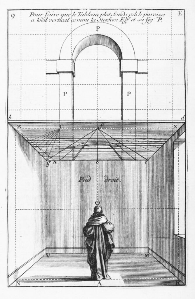 Et en cecy vous considererez de plus, qu’alors que l’on desirera faire sur quelque surface ou Tableau plat-fonds, incliné ou courbe, regulier ou non, une telle representation que l’on pretend estre le naturel, Il faut se contenter de ce que l’Oeil en peut voir, car chacun sçait bien que d’autant que les Planchers des theatres sur lesquels les Acteurs sont posez en representant leurs Comedies, seroient eslevez au dessus de la hauteur de l’Oeil des Spectateurs, d’autant moins verront-ils entiers lesdits Acteurs, & de plus lors qu’ils seroient reculez, enfoncez ou esloignez de la baze dudit theatre.