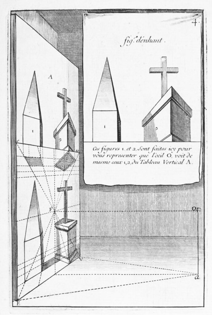 I’ay mis haut à vostre droicte la representation des objets dudit Tableau d’en haut, afin que vous les voyez de front ainsi qu’il est supposé que l’Oeil O du regardant les voit.