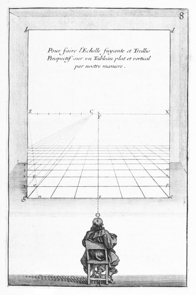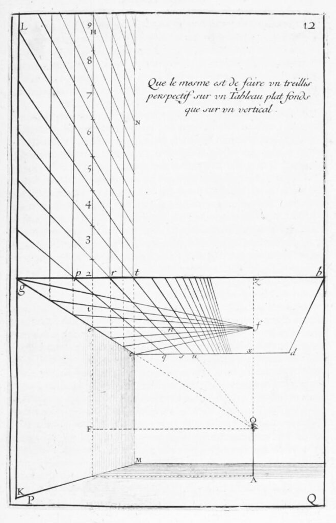 Vous allez voir en la Planche qui suit comme il n’y aucune difference de tracer les eschelles de front & fuyantes perspectives, & par consequent un treillis sur un Tableau plat, horizontal ou en plat fonds, que sur un vertical.