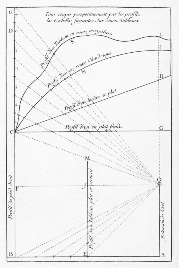 De plus que les coupes ou intersections que font cesdites fuyantes pointées sur ces divers profils de Tableaux sont les points perspectifs que l’on desire trouver sur iceux selon le rayonnement de la veuë & leurs scituations.