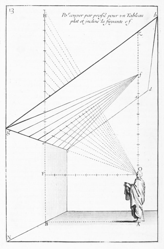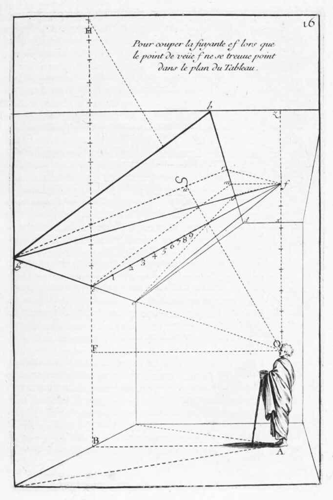 Mon intention est que O point de l’Oeil du regardant A O & tous ces profils de Tableaux & de plans d’assiette, ensemble toutes ces lignes pointées qui vont des divisions desdits plans aboutir audit Oeil O en un mesme point & la pointée O G H I L doivent estre entenduës ou conceuës dans un mesme plan ou coupe.
