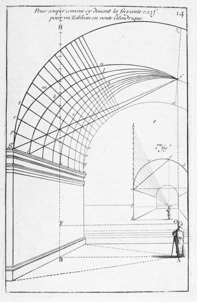 Vous n’aurez plus ayant vostre de front ou baze du Tableau g e c divisée en un pareil nombre de pieds ou parties qu’aurez voulu toutefois égaux ou de mesme grandeur que ceux qui ont servy à couper perspectivement le profil de ladite voute qu’à mener par ces divisions des fuyantes au point de veuë f.