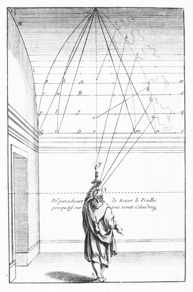 La Planche qui suit est la representation d’un treillis perspectif fait sur une voûte cylindrique & en suite d’elle vous verrez comme lors que le point de veuë ne se trouve point dans l’enclos d’iceux ny sur un mesme plan, il faut avoir recours pour y tracer ledit carrelage ou treillis à un autre moyen, neantmoins tres-facile comme vous verrez.