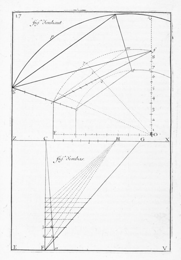 I’ay mis surle pied droict H E, V R les deux treillis perspectifs & leur eschelles fuyantes coupées n Z & H Z, pour faire connoistre que l’on peut se servir de l’une & de l’autre pour faire ledit Tableau modelle estant la mesme chose, vous devez voir aussi que F est le point de veuë.