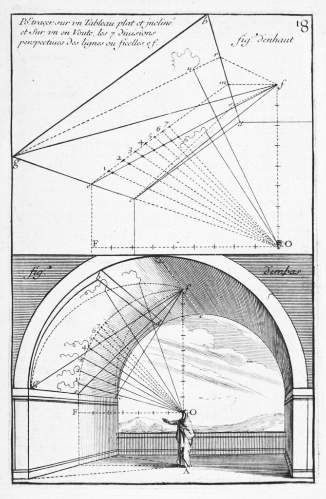 Car il est tres-constant que pour faire que ce qui sera desseigné & peint sur une telle voûte ou plat fonds qui incline ou s’avance vers l’Oeil du regardant, luy paroisse se redresser à plomb ou verticalement sur son pied droict E Q, P V, il faut que les parties de l’objet qui sont ainsi les plus avancées, soient plus petites & plus foiblement colorées à proportion que celles qui sont sur la fondamentale de front E V.