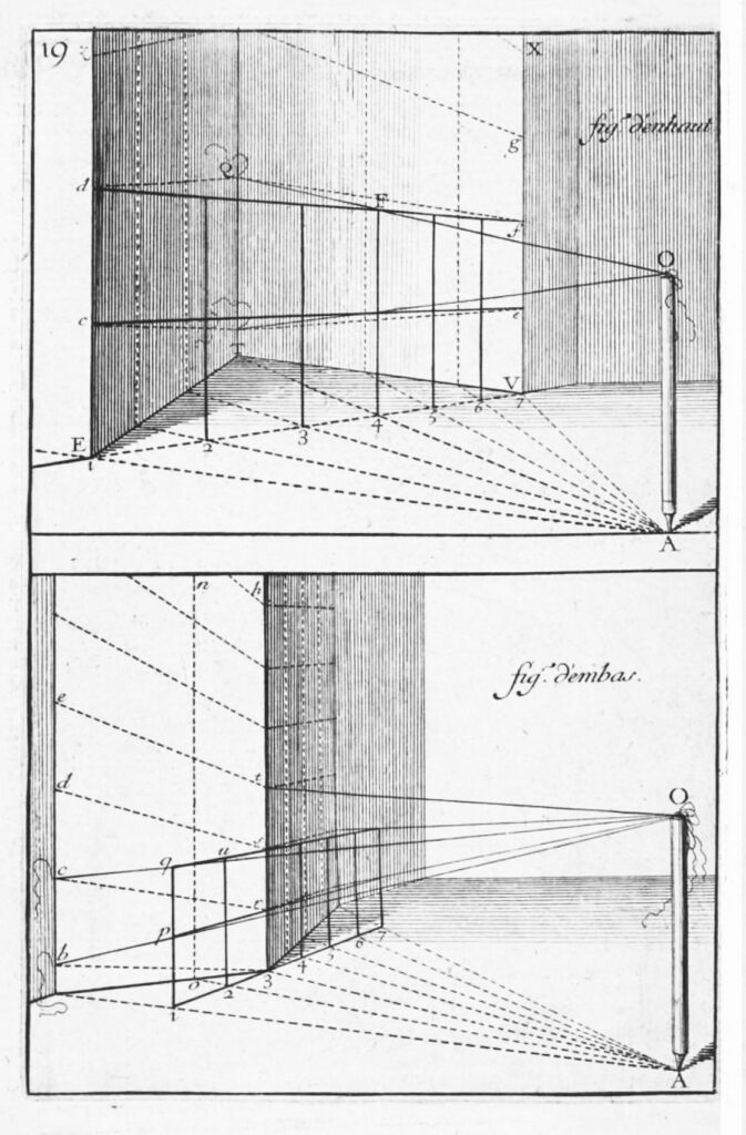 De sorte que si on pouvoit avoir une surface platte aussi grande que le lieu où on est obligé de travailler & en avoir les grandeurs des profils precis on pourroit sur icelle tracer par ce moyen les eschelles fuyantes pour puis apres les raporter sur le Tableau, ainsi que j’espere faire voir en son lieu.