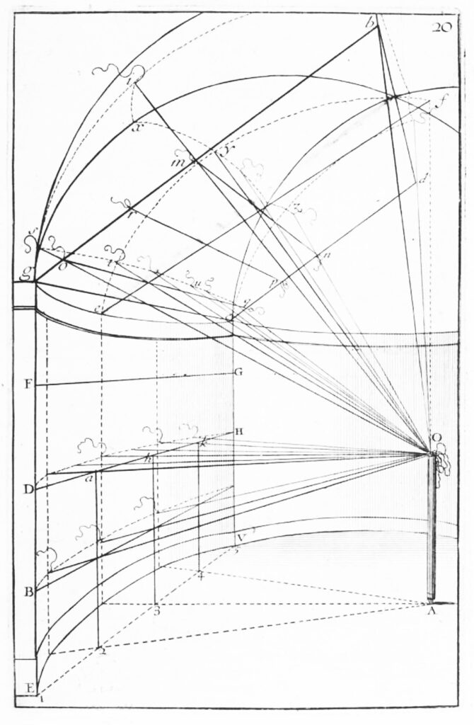 Cette figure vous montre aussi comme parces filets O 1, O 2, O 3, O 4, & autres continuez en ligne droicte iusques à la voute en touchant chacune des divisions ou marques de la ficelle e f sans leur faire perdre à aucunes leurs lignes droictes vous aurez tracé sur ladite voute la fuyante courbe e 1, 2, 3, 4, 5, 6, 7, f laquelle s’y peut faire aussi par les autres moyens cy-dessus.