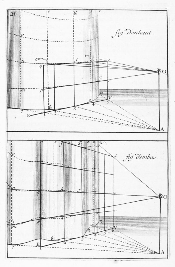 Sur de telles surfaces il suffit d’avoir pour chaque ligne à plomb comme 7, o figure d’embas l’intervale m n qui est celle qui vient du point O passer par les points p q donner cette intervale m n & la porter autant de fois que l’on en a besoin sur ladite ligne 7, o comme de n en o, & ainsi des endroicts i h pour la pointée à plomb 8 e & de mesme des autres qui sont contenus entre les ficelles de front p r, q s & ainsi vous aurez fait vostre treillis perspectif sur ladite surface pour y representer dessus les objets qui sont desseignez & peints sur vostre Tableau modelle & aussi treillissé geometralement d’un pareil nombre que celuy-су ; je vous repete encore que O f est distance dudit Tableau modelle, A O son eslevation d’oeil & par consequent f le point de veuë d’iceluy.