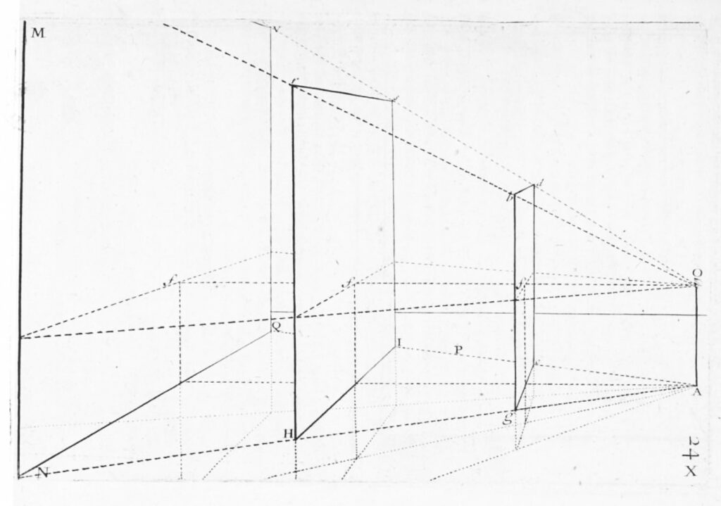 Vous y voyez la ligne A O hauteur du regardant posé à plomb sur le plan d’assiette A H N Q P & le Tableau g c d b, & que les lignes pointées A g H, A P Q, O b r, O d s V, qui embrassent ce Tableau g c d b, ensemble tout ce que ledit œil O peut voir en cette position au delà ou au travers d’iceluy si c’estoit un verre ou surface mince & transparante.