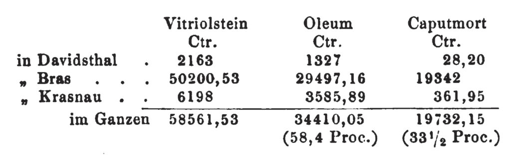 In Kasnau erzeugt man aus 6000 Ctr. littauer Vitriolstein und 1410 Ctr. 66° Schwefelsäure 1363 Ctr. 78° und 2000 Ctr. 80° wasserhelles Oleum, während daselbst aus 9072 Ctr. hromicer Stein 4717 Ctr. ordinäres Oleum gewonnen werden.