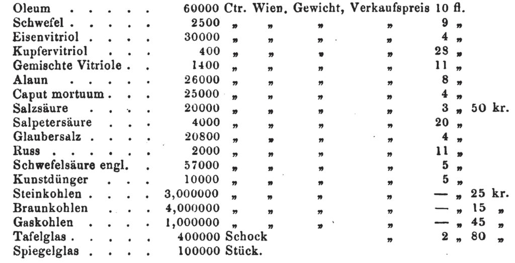 1) Nicht ohne Interesse dürfte nachstehender Preiscourant des Werkes aus dem Jahre 1792 sein. Es kostete der Centner: ordinären Vitrioles 4 fl. 3 kr., Salzburger feinen V. 15 fl., mittelfeinen do. 13 fl., Cyprischen V. 40 fl., Stangenschwefel 10 fl., Schwefelblüthe 20 fl., rothe Farbe in Stücken 5 fl., Berggrün 73 fl. 20 kr., rauchendes Vitriolöl 50 fl., Scheidewasser 30° 50 fl., do. 34° 56 fl., do. 40° 150 fl.