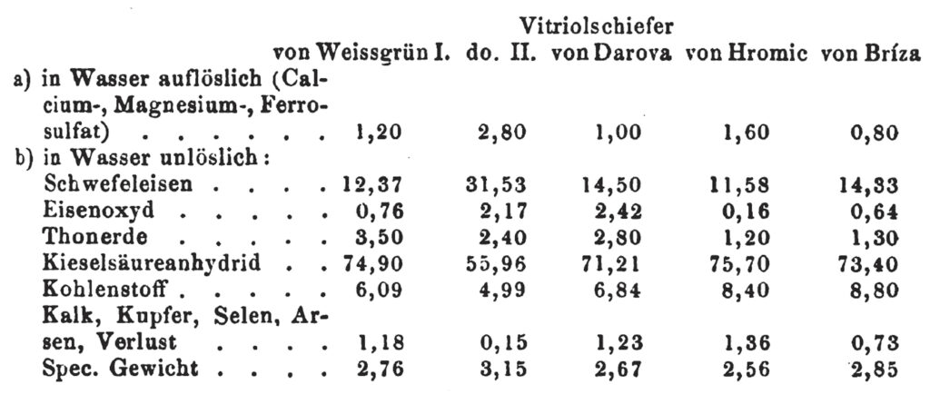 Nach Anthon darf die Qualität der Schiefer durchaus nicht nach dem äußeren Ansehen, am wenigsten aber nach der Menge der sichtbaren Pyritkrystalle beurtheilt werden. Solche sind gar nicht verwitterbar und können noch nach vielen Jahren aus dem total verwitterten Schiefer unverändert ausgelesen werden. Der Werth des Schiefers beruht lediglich in der Menge des äußerst fein zertheilten, gar nicht mit blossem Auge erkennbaren Schwefeleisens, wie dies namentlich die beiden letzten Varietäten documentiren, die so vollständig verwittern, dass sie nach mehreren Jahren blos lockeres, kohlenhaltiges Kieselsäureanhydrid zurücklassen, das im trocknen Zustand vom Wind weggeblasen werden kann. Hieraus folgt auch, dass das früher gebräuchliche Rösten der Vitriolschiefer nicht nur nichts nützte, sondern direct schadete, indem dabei eine namhafte Menge Schwefel verbrannte, welche ausserdem in Schwefelsäure übergegangen wäre.