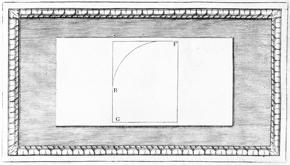 IN QUESTO & in ogn’ altro caso non dee dar noia al pittore come si stia il muro dove esso dipinge, e massime havendo l’occhio che riguarda tal pittura à vederla da una finestra, o da altro spiracolo : perche l’occhio non hà da attendere alla planitie, overo curvità d’esse parti, mà solo alle cose che di là da tal parete s’hanno à dimostrare per diversi luoghi della finta campagna. Mà meglio si farebbe tal figura nella curvità F. R. G. perche in essa non sono angoli.