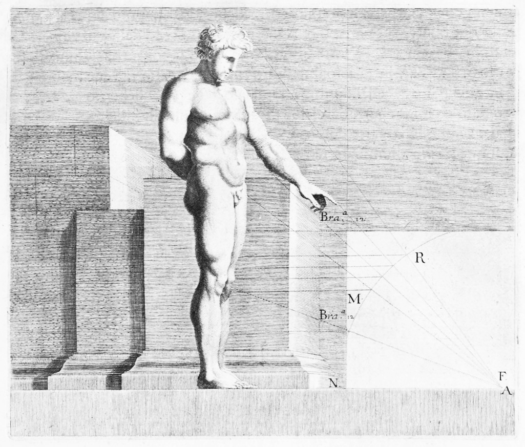 Se vuoi far figura o altra cosa che apparisca d’altezza di 24. braccia, farai cosi. Figura prima la parete M. N. con la metà dell’ huomo che vuoi fare, di poi l’altra metà farai nella volta M. R. Mà fà prima sul piano d’una sala la parete della forma che stà il muro con la volta dove tu hai à fare la tua figura, di poi farai dietro a essa parete la figura disegnata in profilo di che grandezza ti piace, e tira tutte le tue linee al punto F. e nel modo ch’ elle si tagliano su la parete N. R. cosi la figurerai su’l muro che hà similitudine con la parete, & harai tutte l’altezze e sporti della figura, e le larghezze, overo grossezze che si ritrovano nel muro dritto M. N. farai la sua propria forma, perche nel fuggir del muro la figura diminuisce per se medesima. La figura che và nella volta ti bisogna diminuirla, come se ella fusse dritta, la quale diminutione ti bisogna fare in su una sala ben piana, e li sarà la figura, che leverai dalla parete N. R. con le sue vere grossezze, e ridiminuirle in una parete di rilievo, e fia buon modo.