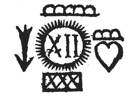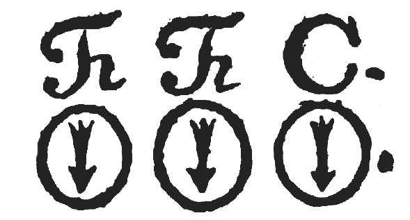 Welches in folgender Erklärung zu verstehen: Das mittelste Zeichen heisset ein Rauten-Crantz mit Churfürstl. Schwerdtern. Das neben an auf der lincken Hand ein Herz, über dasselbe eine Crone, welche offen gebrannt. Das zur rechten Hand heisset eine Lilie, oder wie es sonsten genennet wird, eine Brand-Säule, welches zwar die Böhmische Farbe auch führet, doch mit einiger Veränderung das oberste Zeichen, eine vollgebrannte Crone, welche just über dem Rauten-Crantze stehet. Das unter dem Rauten-Crantze ist ein viereckigtes, mit 4 Nägeln, klein angemachtes dünnes Brettgen, welches an den Faßboden mit angenagelt ist. Dieses befindet sich darum allhier, damit man die Proben von Farben heraus verlangen kan, und nicht nöthig hat, den gantzen Faßboden deswegen zu eröffnen. Unter dieses Zeichen kommen die General-Brand-Buchstaben, als z. E. F. C. oder M. C. um damit anzuzeigen, was für eine Sorte Farbe sich in diesem oder jenem Fasse befindet. Alle Sächsische blaue Farbe ist durch gängig viel feiner, als alle Böhmische. Bey der Böhmischen ist durchgängig das Haupt-Brand- und General-Zeichen der Buchstaben oben; und unter solchen Buchstaben drey gebrannte Brände,
