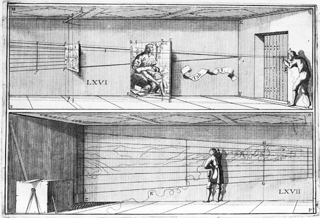 L’on peut aussi par cette metode de Perspective, faire que les piliers, ou les colomnes d’une longue galerie parestront comme un seul plan qui aura une image bien proportionnée, & qui ne parestra que par pieces à ceux qui se pourmeneront dans cette galerie, au lieu que du point de l’oeil proportioné à la Perspective, les portes mesmes qui se rencontreront entre les colomnes, & les interruptions qui se peuvent rencontrer, n’empescheront point qu’on ne voye une image bien proportionée, & continue, soit qu’on la face sur une muraille plate, ou à une voute, &c. Or le lieu de ces Perspectives doivent estre biens clairs afin de discerner les couleurs, & les traits éloignez, & affoiblis quoy que la premiere lumiere du Soleil ne les doive pas illuminer, parce que cette lumiere estant trop forte fait évanoüir les couleurs, ou les confond : c’est pourquoy it le faut empescher d’entrer par les fenestres avec des voiles fort blancs & delicats, afin qu’il demeure assez de lumiere.