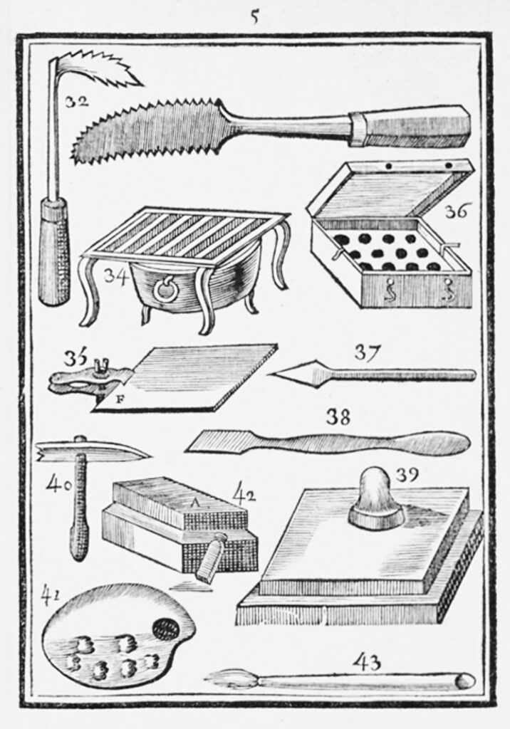 On se sert de palette d’ivoire pour la Peinture en miniature. Les Peintres Flamands qui faisoient des ouvrages très-terminés, employoient la palette de crystal. Messieurs de Caylus & Majault préférent les palettes d’écaille aux palettes de bois, pour la Peinture à la cire, parce que ces dernieres absorberoient le vernis qui donne la fluidité aux couleurs, ce que l’écaille ne fait pas. Voyez notre Préface.