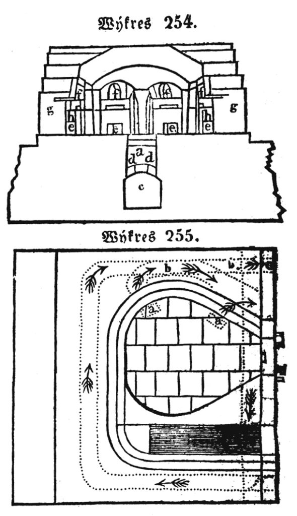 Peci prazeci wykres 254. předstawuge průřez kolmy, wykres 255. ale průřez rownowážný nad gegj půdau. Pec připřipravená gest k topenj dřjwjm, njstěg z ploten hliněných ohňowzdorných udělána. Dýmy a plyny z pražených rud wystupugjcj ženau se lisskami a, a do ryh b, b, a přicházegj u c do gedogemu (Giftfang). K sázenj a čistěnj ryh gsau na mistech priměřených djry.