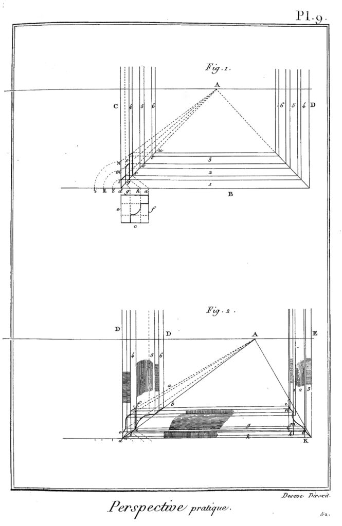 Planche IX. Mettre une corniche en perspective au plafond, le point de vue étant au centre, fig. 1. – Mettre une corniche en perspective au plafond, le point de vue étant de côté, fig. 2.1