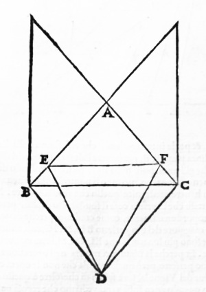 Sia verbi gratia il triangolo A B C, una quarta parte della soffitta, & non si possa vedere la linea piana B C, con la distantia D, per esser l’angolo B D C, molto maggiore dell’angolo del triangolo equilatero: però pigliando la distantia conveniente, si vedrà la Prospettiva nella E F, sotto l’angolo E D F, che sarà minore dell’angolo del triangolo equilatero, & capirà benissimo nella pupilla dell’occhio, & cosi la Prospettiva apparirà d’essere piu di lontano, & la stanza piu alta che non è.