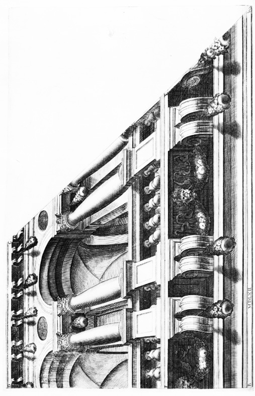 Ma delle Prospettive fatte nelle soffitte, se ne vede una rarissima in Bologna nel palazzo del Signore Iasonne, & del Signor Pompeo Vizani, giovani gentilissimi, & molto amatori della virtù, quali hanno mostrato un magnificentissimo animo nel fabbricare un palazzo molto ornato d’Architettura antica, arriccandolo poi di molte nobili pitture, fatte da eccellenti maestri, tra le quali è cosa rarissima la soffitta della sala principale, fatta da Tommaso Laureti Siciliano di sopra nominato, con molto studio, si come egli ha usato ordinariamente in tutte l’opere sue fatte in Bologna, & altrove: & al presente nel fare gl’ornamenti di pittura tra le storie nella volta della sala di Constantino, mostra quanto di questa nobil pratica sia intendente. Il disegno posto in questo luogo ci mostra la quarta parte della sopra nominata soffitta, in tutto simile a esso disegno, fuor che in luogo delli festoni, che sono tra una mansola & l’altra, vi sono non so che altri ornamenti. Circa di che non accade altro dire, perche essendo la soffitta piana, fece li cartoni con la regola solita, come se havesse havuto à dipignere in una parete piana, & fatta la quarta parte del cartone, le servi per l’altre tre quarte della soffitta: & perche la linea A B, era troppo lunga rispetto all’altezza della soffitta, & l’angolo del triangolo, la cui basa se fusse stata la linea A B, non sarebbe capito nella pupilla dell’occhio, però prese la linea E F, & nello spatio che è tra la linea A B, & E F, vi fece la cornice, con le mensole per posamento de’ piedistalli, facendo una parte dell’ architrave nel muro, & una parte nella soffitta, & venne à guadagnare tutto lo spatio che è tra la linea A B, & E F, & fece apparire tanto piu alta la soffitta, & la sala. Et havendo prese l’ombre & i lumi dal modello, la colorì pulitissimamente, fingendo questa loggia di diverse nobilissime pietre. Et accompagnò poi questa soffitta con un ricco fregio di storie nella muraglia de’fatti di Alessandro magno, & nel mezo d’essa soffitta vi fece una storia, dove è la Fama con i piedi sopra il Mondo, & ha’ à man destra l’Honore, & à man sinistra la Vittoria, la quale accennando col dito mostra alla Fama il Mondo vinto da Alessandro, acciò celebri & sparga il nome suo per tutto, in ciascun secolo avvenire.