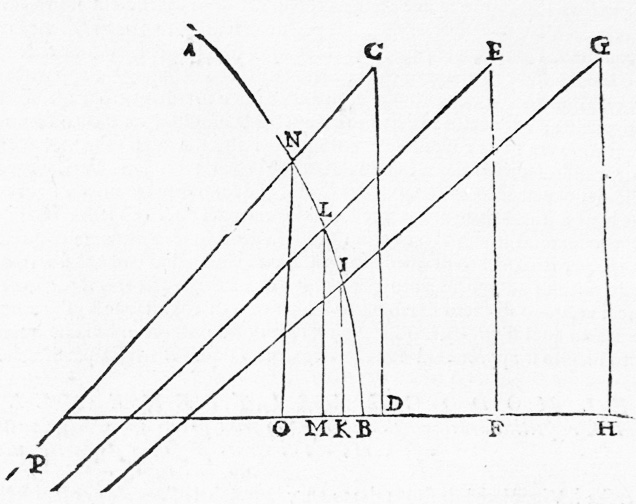 Questa è assolutamente la piu difficile operatione,che possa fare il Prospettivo, non la potendo conseguire interamente con la regola, per la varietà & irregolarità delle volte, nè fin quì da nessuno (che io sappia) n’è stato scritto poco nè assai. Però dalla figura del capitolo terzo del Vignola ho cavato la presente regola, la quale aiutata dalla pratica, ci darà l’intento nostro. Ricordianci adunque della figura del prenominato capitolo, & come dalla parete venga tagliata la piramide visuale, che dall’ottangolo và all’occhio, & immaginianci che la volta, nella quale s’ha à dipignere la Prospettiva, ha da fare l’effetto d’essa parete. La onde quando ci sarà proposta la volta per farvi la Prospettiva, bisogna primieramente pigliare la circonferenza del suo sesto con una centina, & segnarla nel cartone, & poi mettervi appresso le grandezze perfette delle cose, che si vogliono disegnare nella volta, & tirando da esse linee rette fino al punto della distantia, si segneranno nell’arco della volta le intersegationi, che le prefate linee ci danno. Come per esempio, sia il sesto, ò centina della volta la A L B, & siano l’altezze, ponian caso di tre colonne, le C D, E F, & G H, che s’hanno à disegnare nella volta. Et per che il punto della distantia, come nella precedente regola s’è detto, s’ha da porre nel mezo della stanza, si metterà sotto alla centina della volta A L B, proportionatamente, come starebbe il punto P, dove le tre linee, che si partono dalli tre punti C, E, G, si vanno à congiugnere insieme; & dove esse linee taglieranno la centina della volta ne’punti I, L, N, ci daranno l’altezza delle tre predette colonne. La I K, per rappresentare la G H, piu lontana, sarà minore della L M, che rappresenta la E F, & così la N O, che viene dalla C D, piu vicina dell’ altre, sarà maggiore di tutte.